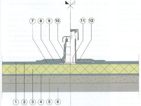 8 - Strat suplimentar, tras prin incalzire pe corpul gurii de aerisire si sudat impermeabil pe stratul superior de hidroizolatie;